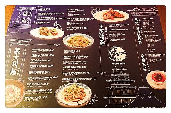 位於國父紀念館旁的 Nagomi Pasta 餐廳是走家庭式的路線,一走進餐廳,映入眼簾的便是簡單日式大地色系裝潢,開放式廚房,有幾位年輕廚師正在廚房忙碌著。果然是日本人也會吃的餐廳,剛好用餐時,隔壁桌的兩位男女正是操著純正口音的日本人,看了一下菜單,的確是具有日式風格的料理,如和風溫泉蛋烏魚子生菜沙拉、和風明太子中卷麵、日式雞唐揚,以及奶油明太子綜合海鮮麵等等。
